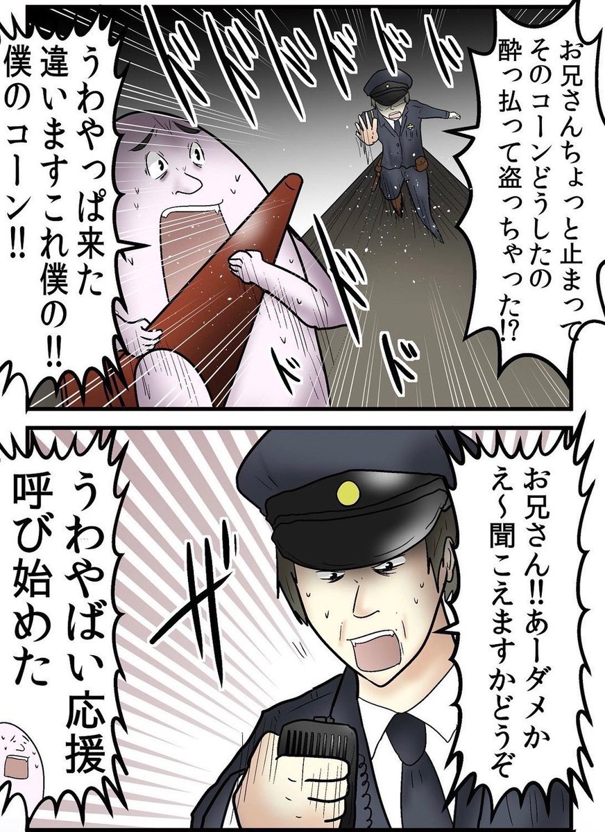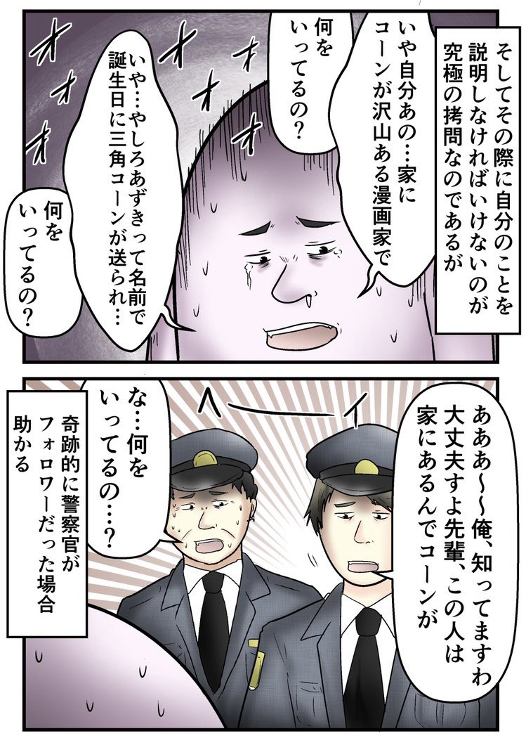 やしろあずき@yashi09 : "『三角コーンで職質を神回避』した話1 2"。