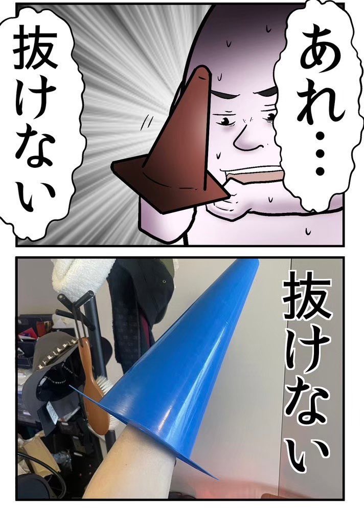 悲報 家にある三角コーンで遊んだ結果② 🔺この続きはストーリーズから読めるよ!絵日記やしろあずき漫画ギャグ漫画日常4コマ漫画三角コーン。