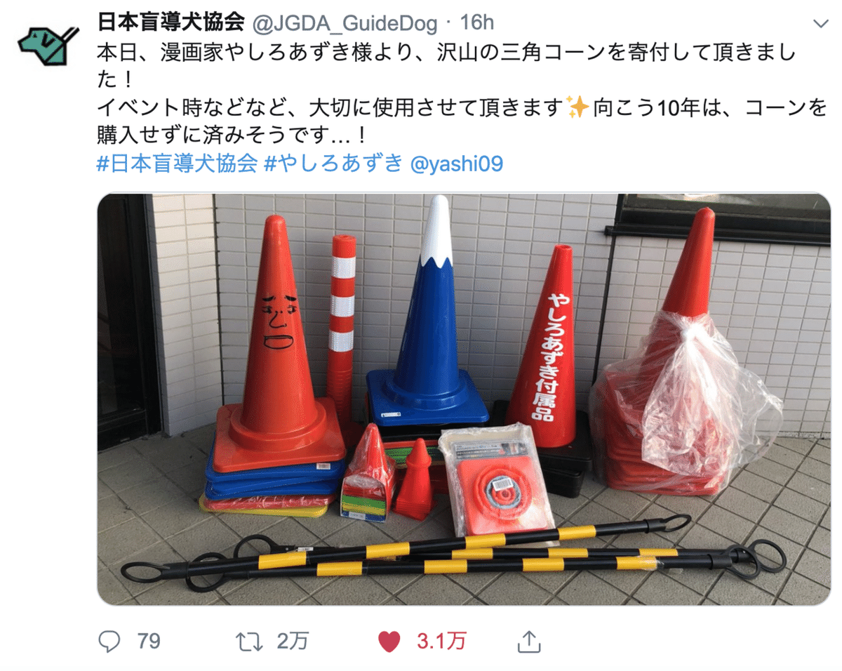 やしろあずき先生が日本盲導犬協会に三角コーンを寄付『社会貢献に利用されて嬉しい』とファンやお母さんが感激「家の分のコーンが足りなくなっている」3ページ目- Togetterトゥギャッター。