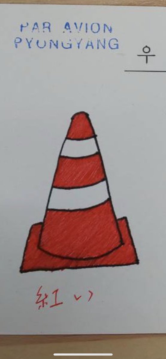 やしろあずき@yashi09 : "北朝鮮から三角コーンに『紅い』って書いてあるイラストつきの手紙がマジで送られてきた事があったんだけど "。
