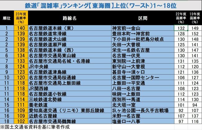 最新!鉄道「混雑率」ランキング 東海版ワースト18 名古屋市営地下鉄とJRの“シン・痛勤地獄”とは?News&Analysisダイヤモンド・オンライン。