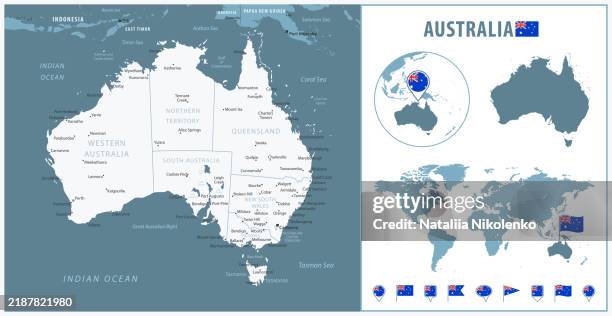 オーストラリア 世界地図と地球上の場所との詳細な青い国の地図 インフォグラフィックアイコン ベクターイラスト ストックベクター ©gt29664133744。