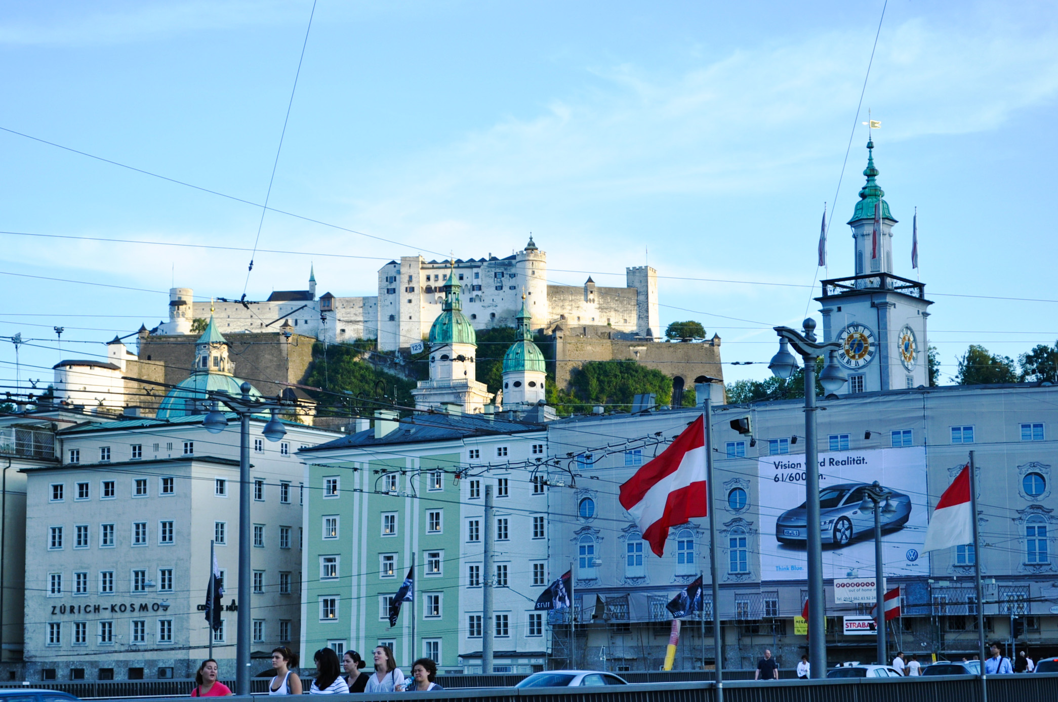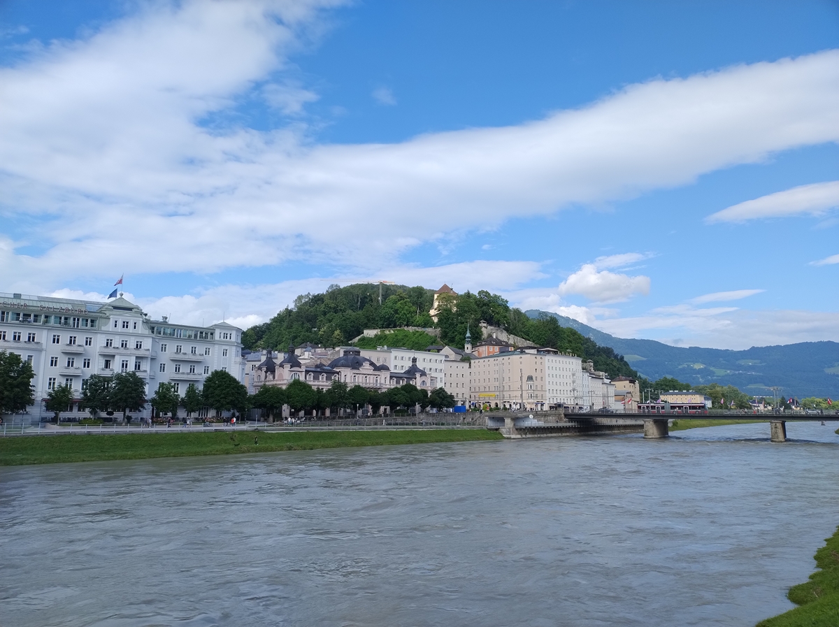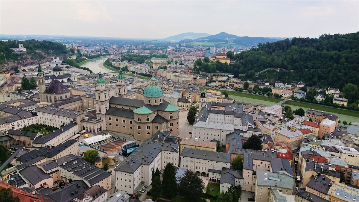 夏のザルツブルク ホーエンザルツブルク城とザルツァハ川とザルツブルクの町並み オーストリアの風景Beautiful Photo.net世界の絶景 美しい景色。