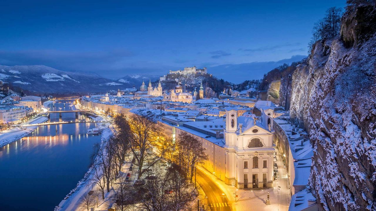 ホーエンザルツブルク城とザルツァハ川 クリスマスの時期のザルツブルクの町並み オーストリアの風景Beautiful Photo.net世界の絶景 美しい景色。
