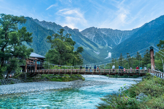 信州 長野県松本市上高地 梓川の清流にかかる河童橋と穂高連峰の写真素材FYI04289537ストックフォトの QleanMarket キュリンマーケット。