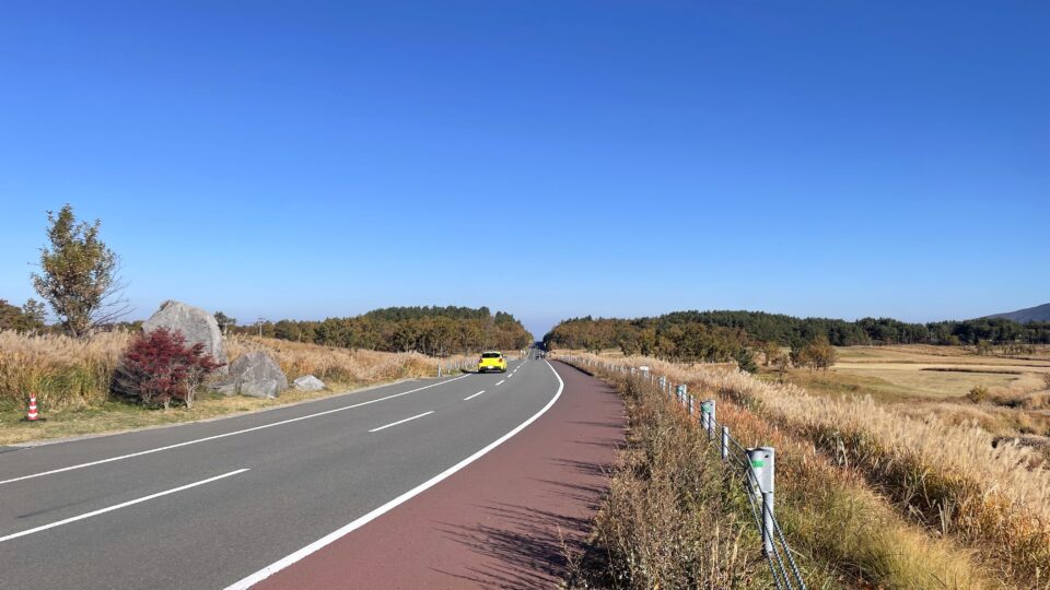 九重町の美しいやまなみハイウェイをドライブする秋。