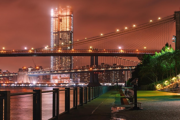 ブルックリンブリッジBrooklyn BridgeとマンハッタンLower Manhattanのスカイラインをニューヨーク市の ブルックリン・ブリッジ・パークから眺めるPremium写真。
