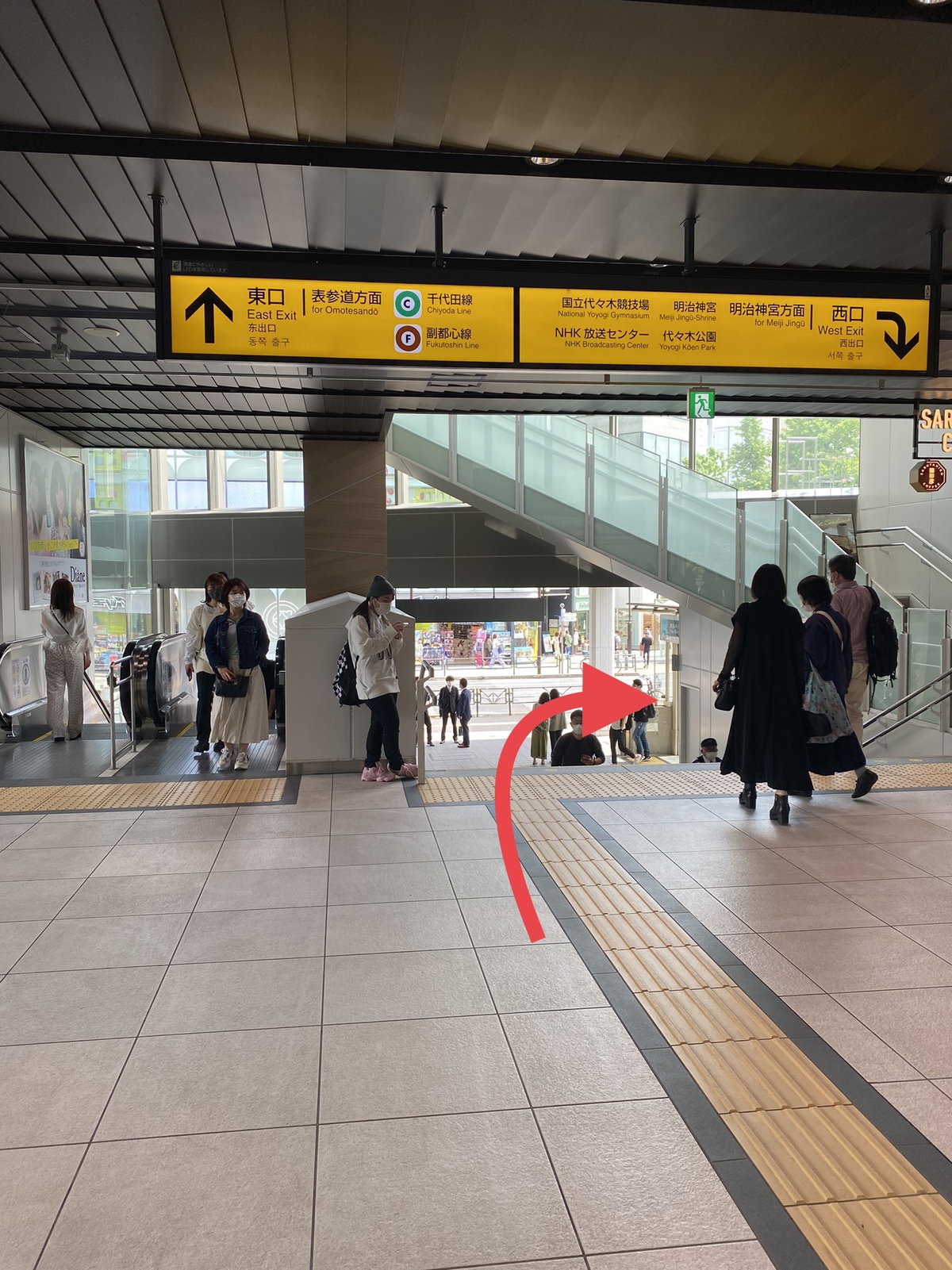 階段 表参道改札へ1分で行くには 原宿駅:山手線外回り山手線パタパタ乗り換え案内。