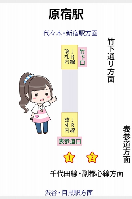 原宿駅:わかりやすい構内図を作成、待ち合わせ場所2ヶ所も詳説!関西の駅ガイド。