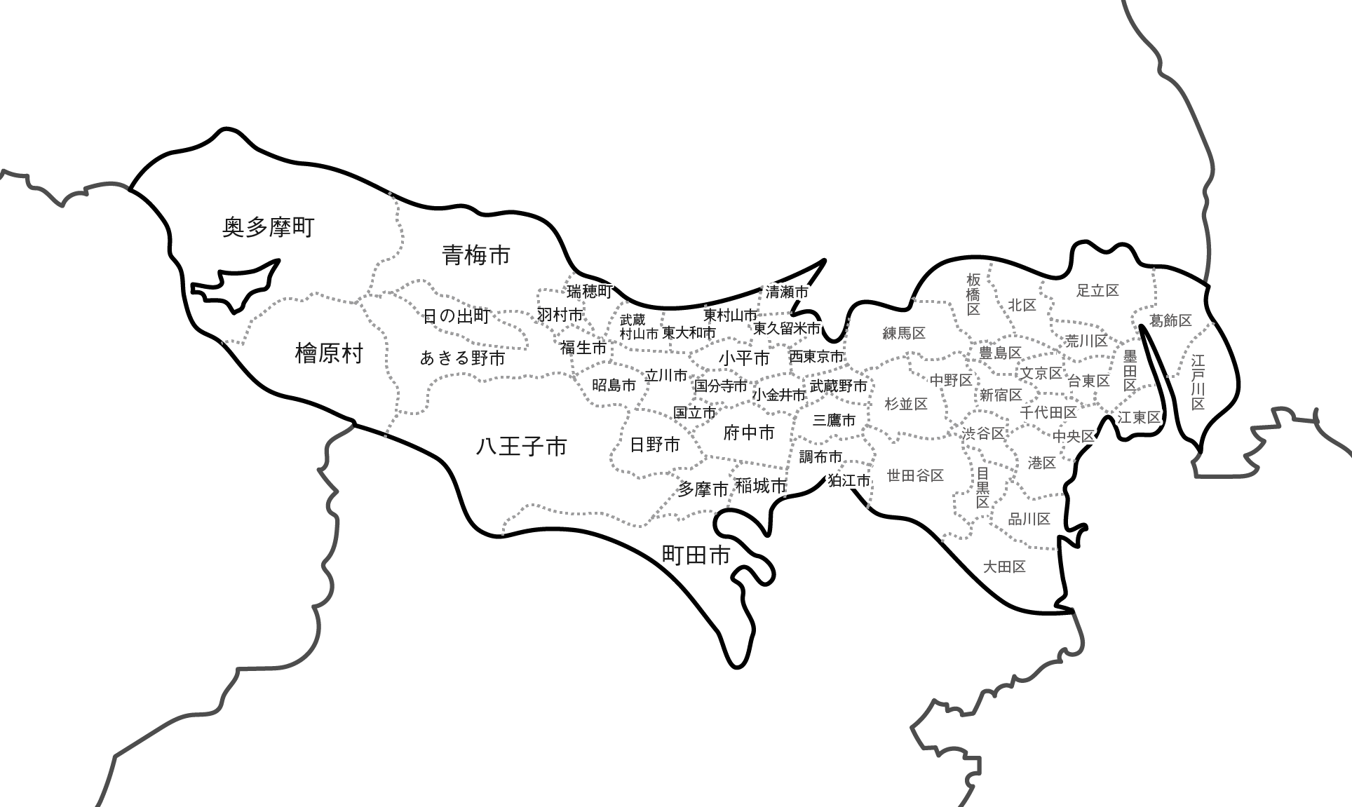 白地図フリーイラスト東京都・ラインあり・市区町村名あり・隣県あり。