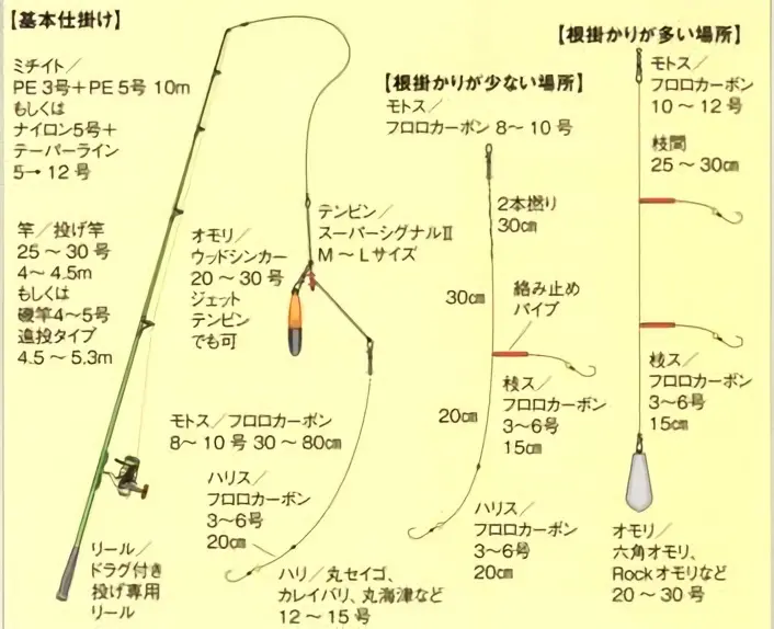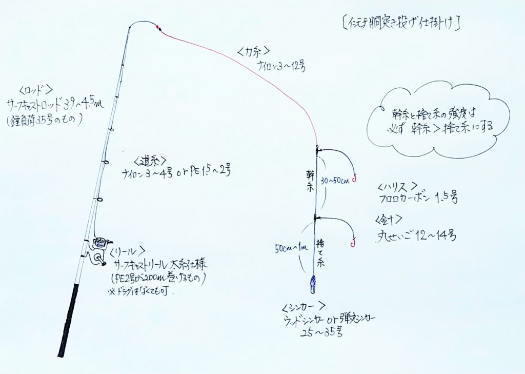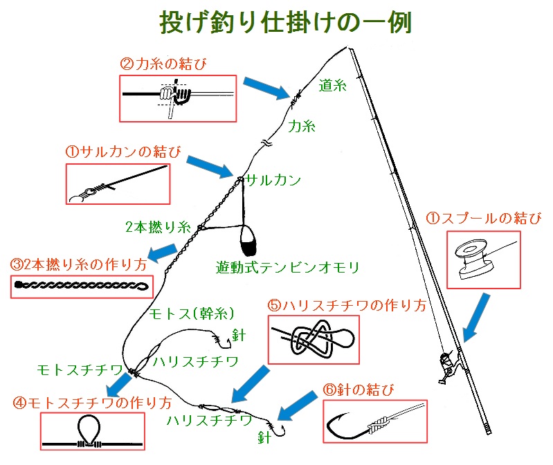 投げ釣り仕掛けの作り方 結び方 固定仕掛け 遊動仕掛け 段差仕掛け テンビン 鈎ハリ ハリス モトス スナズリ ヨリモドシ。