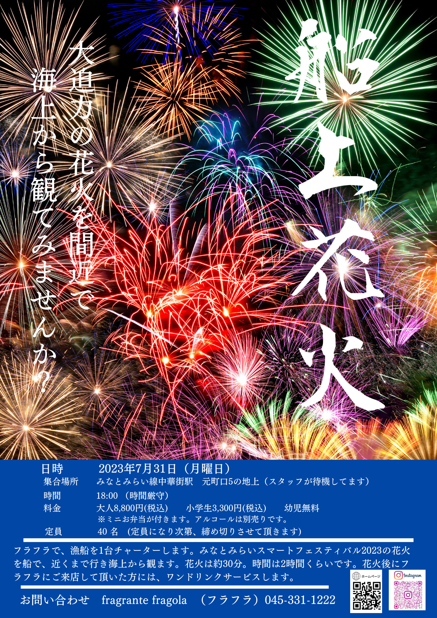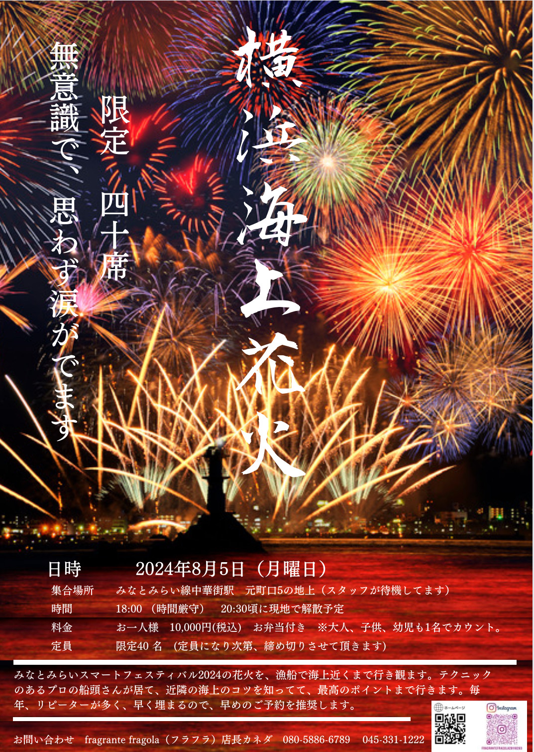fragrante fragola イタリアン 横浜 保土ヶ谷みなとみらいスマートフェスティバル 夏の風物詩! 横浜花火のご案内 山下公園の花火みなとみらいスマートフェスティバル2025です日時 2025年 8月4日 月曜日 料金 お一人様 10,000円 税込お弁当付き※大人、子供。