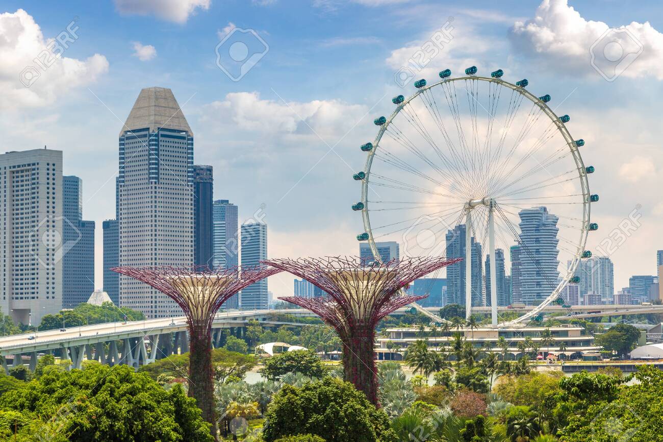 シンガポール-2018年6月23日:シンガポールフライヤー-世界最大の観覧車と夏の日のマリーナベイサンズホテル近くのシンガポールのガーデンズバイザベイの写真素材・画像素材Image 151523235。
