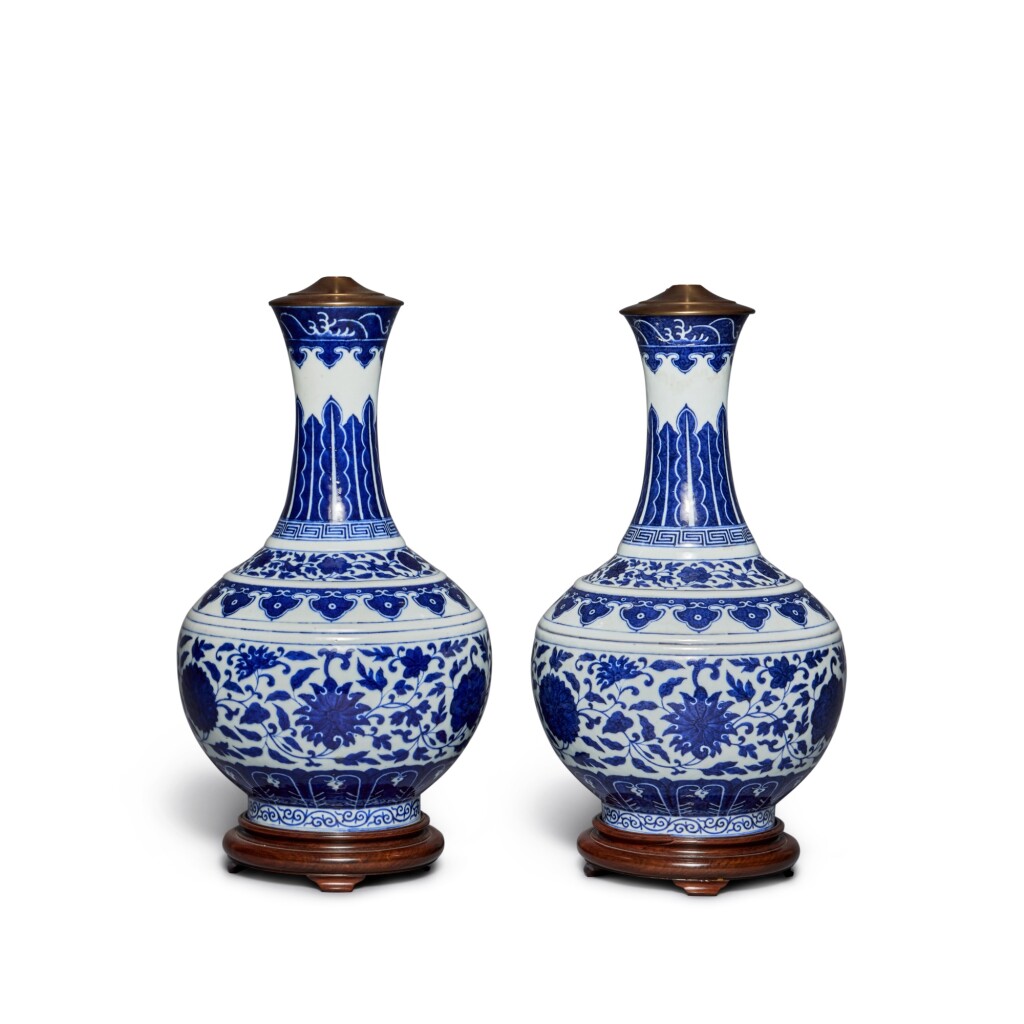 A pair of Ming-style blue and white bottle vases, Marks and period ofGuangxu清光緒青花纏枝蓮紋賞瓶一對 大清光緒年製 款 HOTUNG何東。