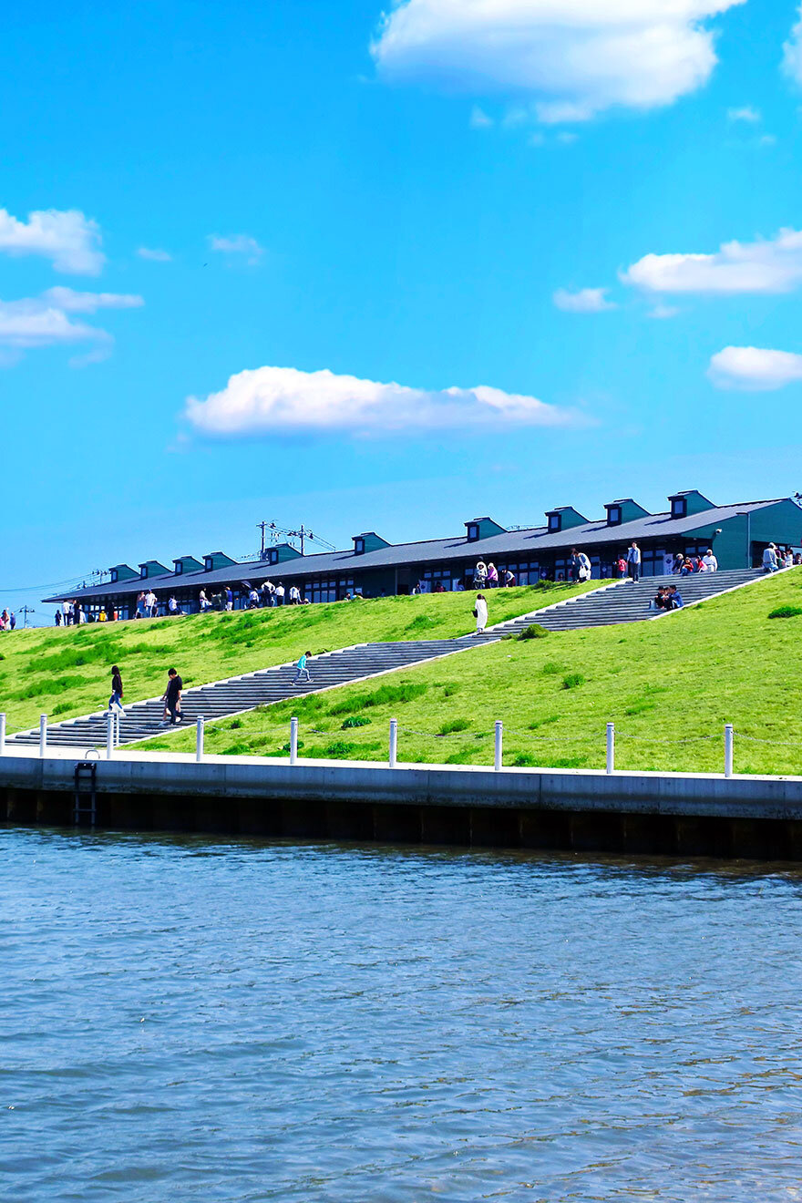 宮城県・東松島市にある宮戸島月浜のみんなの家 鉄骨と木のハイブリッドな構造と波打つ屋根が特徴的東日本大震災で被災した浜辺に建てられた漁業復興の拠点で、さまざまな用途に使われるよう一見複雑に見えますがシンプルな平面計画になっています概要設計:妹島和。