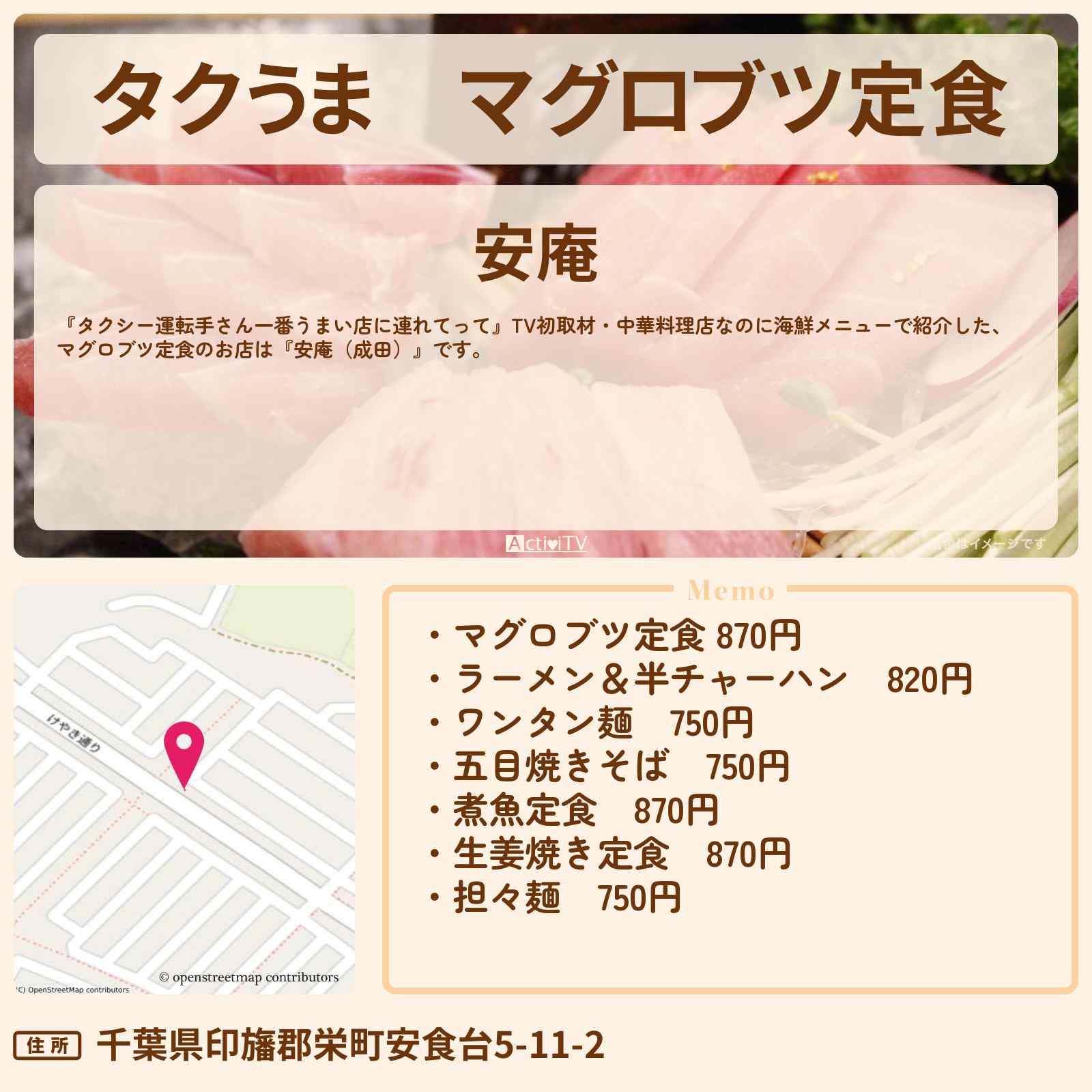 タクうま マグロブツ定食『安庵 成田 』のお店の場所 タクシー運転手さん一番うまい店に連れてってActiviTV。