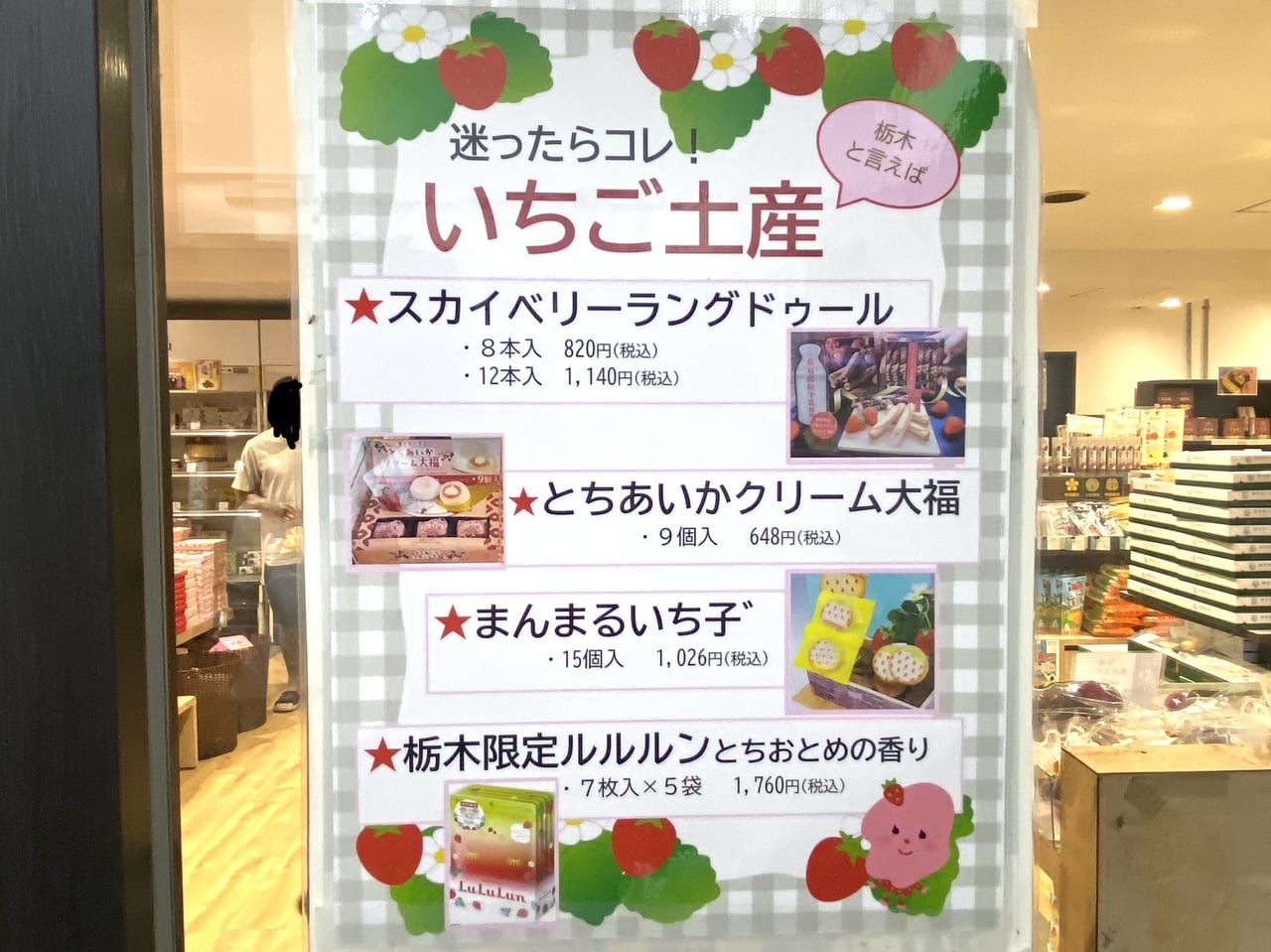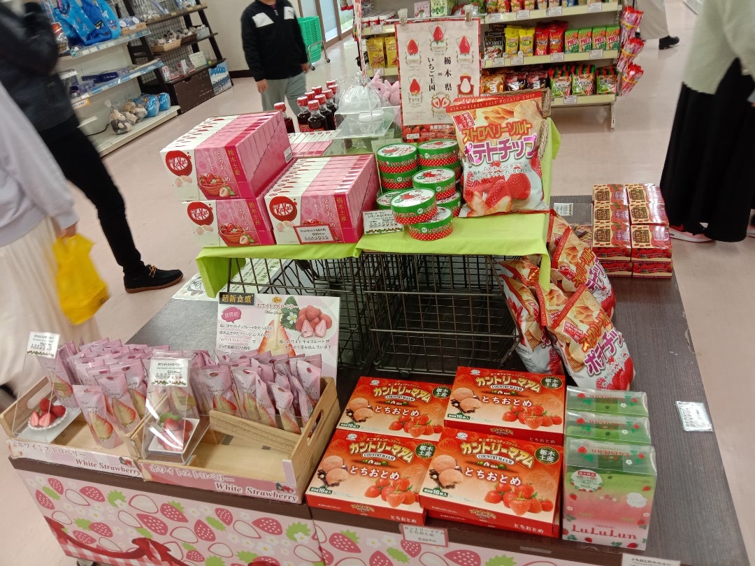 いちごのお土産。いちごの季節 真っ盛りですね。この時期エリア内はいちごづくし!色々な“いちご商品”を揃えています。レストランやフードコートでも“いちごのデザート”を販売中!いちごお土産栃木限定いちごフェア。