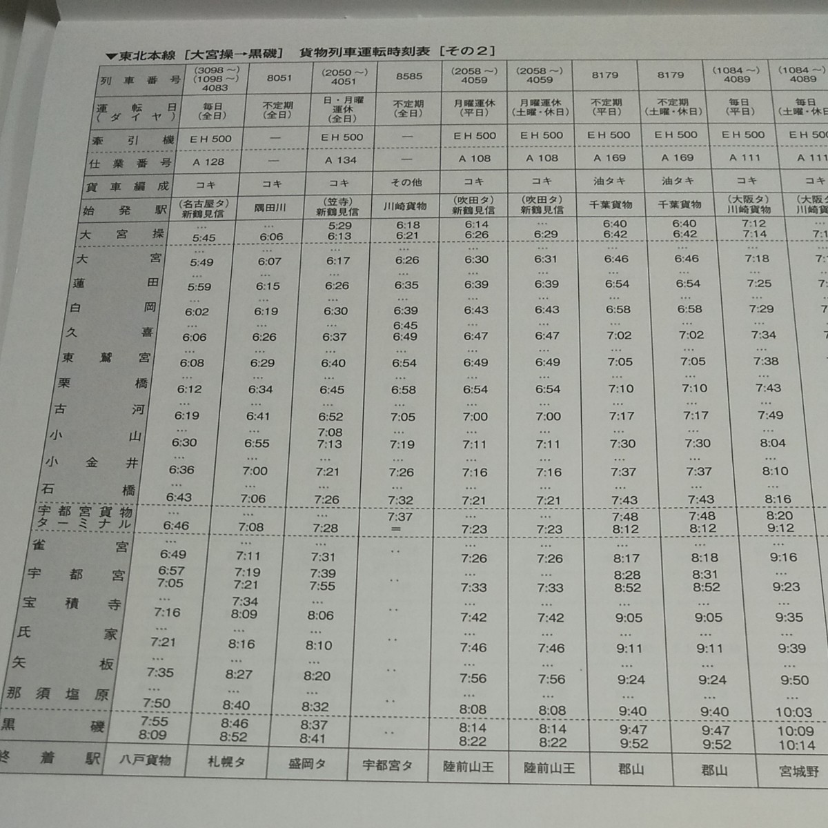 東北本線貨物列車時刻表 宮城野-盛岡2022.3.12。