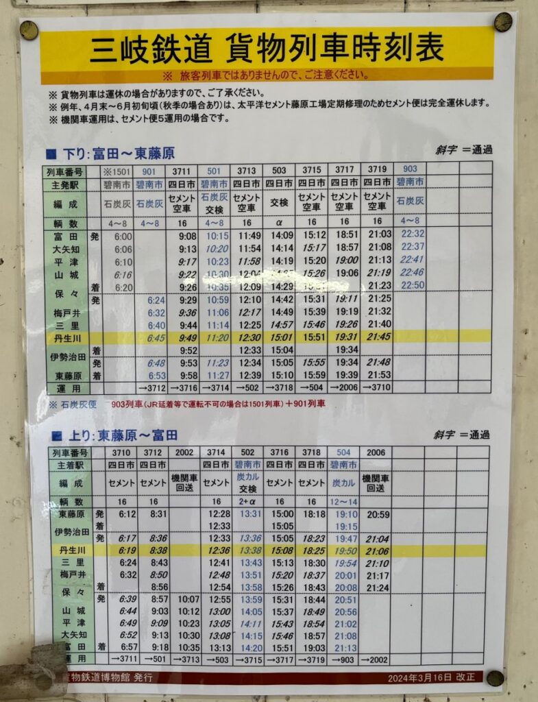 東北本線貨物列車時刻表 宮城野-盛岡2024.3.16。