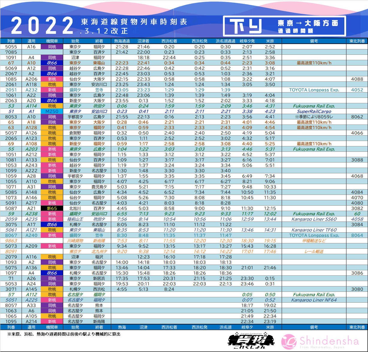はるつばめ 貨物これくしょん編集部 on X: "お待たせしました。2022年3月改正の東海道線 JR東海管内 貨物列車時刻表です。列車番号順と時刻 順の2パターン用意しました。東海道に限って言うと、今回のダイヤ改正は小規模なもので、列車の廃止・新設はほぼありませんでした。